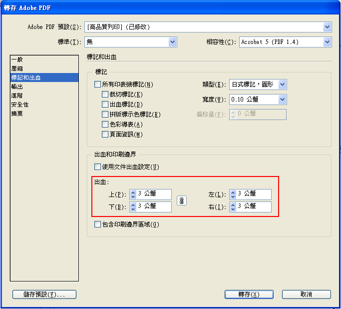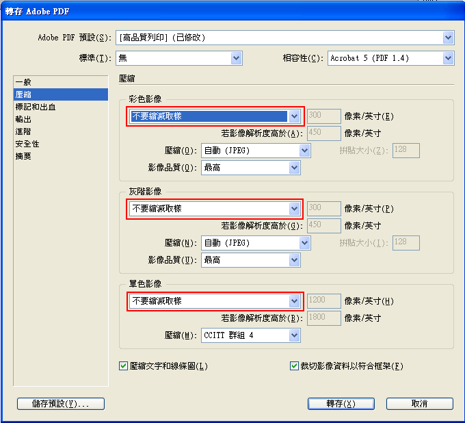 Indesign轉存PDF檔 ※請務必仔細看到最後一個步驟 檔案>「轉存」(Ctrl+E) 存檔類型「Adobe PDF(列印)」>儲存 會跳出如圖視窗,請先選擇「高品質列印」來更改設定 於「壓縮」中,全部改為「不要縮減取樣」如下圖 若有插圖請務必注意! 於「標記和出血」中 A出血設定為每邊3mm>轉存 B若在開啟頁面便有設定出血者,請勾選「使用文件出血設定」(但還是請確認每邊皆為3mm)>轉存