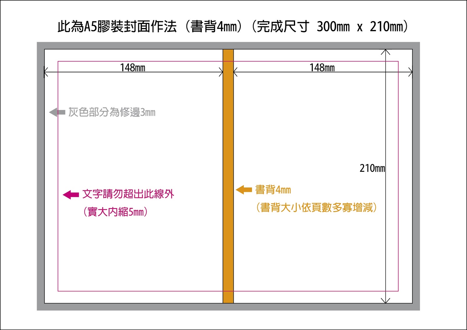 膠裝封面A5:版面請開:(30.2+書背)×21.6cm